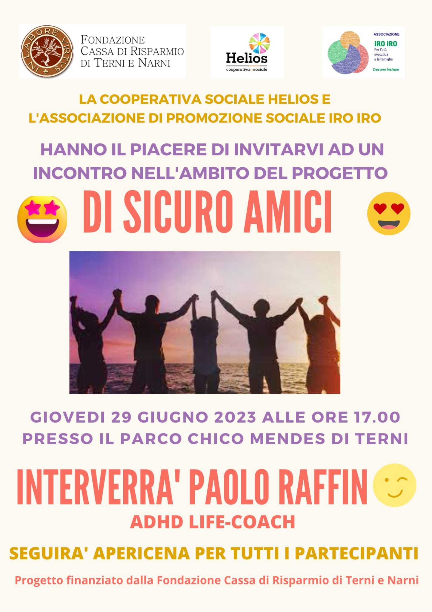Il giorno 29 giugno dalle ore 17.00 alle ore 19.00 presso il Parco “Chico Mendes” di terni, la Cooperativa Sociale Helios e l’Associazione IRO IRO invitano la cittadinanza al seminario relativo al progetto “Di Sicuro Amici”, finanziato dalla Fondazione Carit e rivolto ad adolescenti con problematiche del neurosviluppo e DSA ed alle loro famiglie. Il progetto è stato concepito come un contenitore di occasioni attraverso le quali i ragazzi, con l’esperienza in prima persona, possano esplorare, confrontare e condividere con il gruppo dei pari, vissuti ed emozioni, con il supporto e la mediazione di un’équipe specializzata, che ha il compito di pianificare, programmare e coordinare le attività e di facilitare le relazioni all’interno del gruppo.